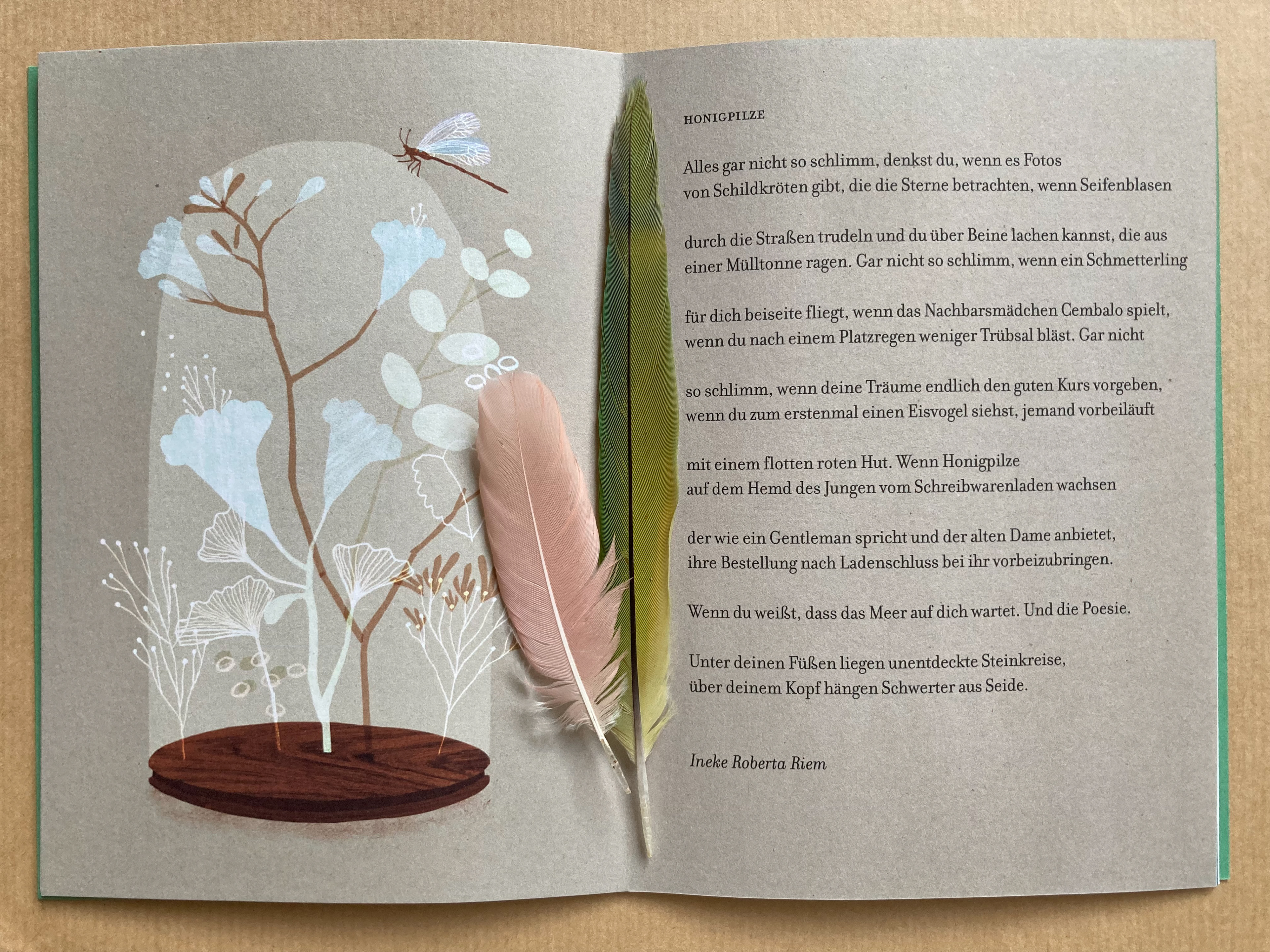 Het Kakkerlakje 'Een veertje voor jou' van Uitgeverij Loopvis is vertaald in het Duits en nu over de grens te koop. Er staan vijf gedichten over troost in 'Eine Feder für Dich', waaronder mijn gedicht 'Honingzwammen'/'Honigpilze', dat gaat over je verwondering bewaren in zware tijden. De vertalingen zijn van Birgit Erdmann.